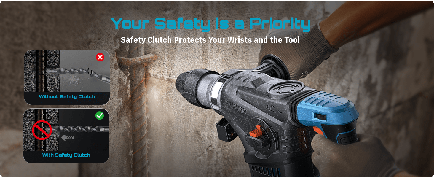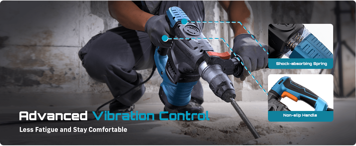 Switch between Hammer Drill, Drill, Chisel, and Chisel Alignment to use one tool as your hammer drill for concrete, masonry drill, and light concrete breaker. The SDS-Plus chuck speeds up bit changes, a safety clutch helps protect your wrist if the bit binds, and the anti-vibration design plus 360° auxiliary handle keeps you in control on long days. It’s a dependable SDS hammer drill for contractors and DIYers alike—ready for tile removal, ceiling installs, basement work, and outdoor masonry.