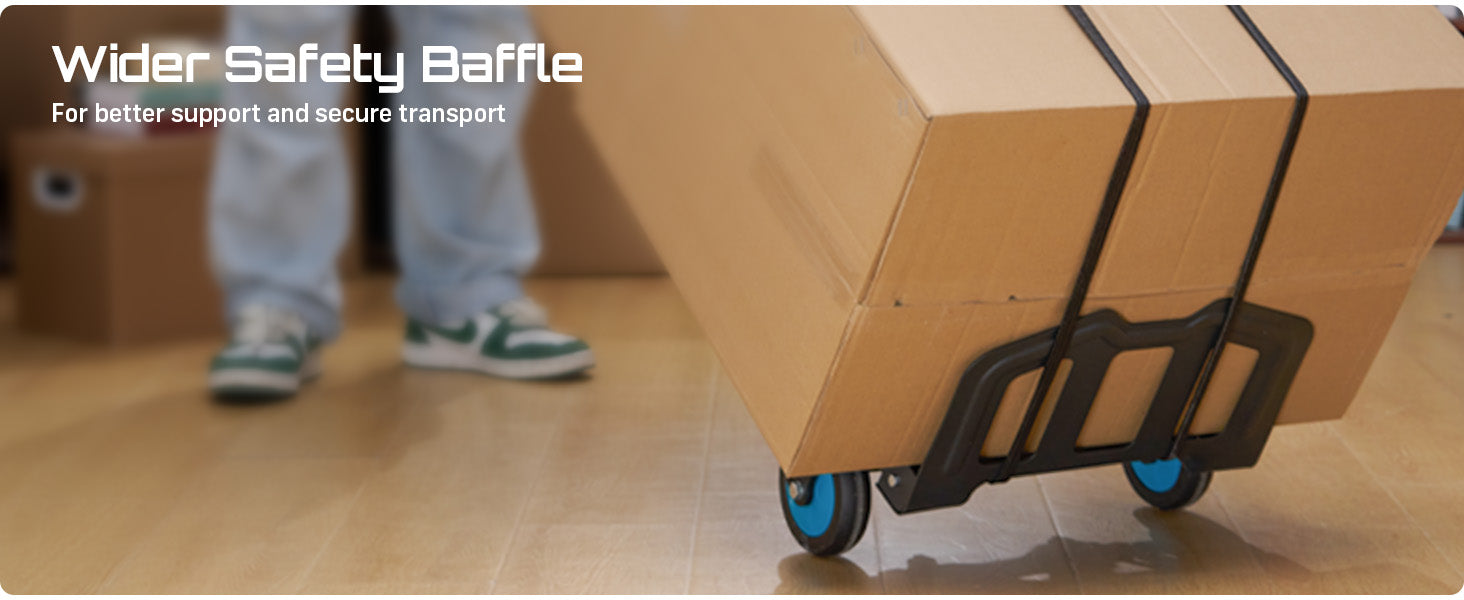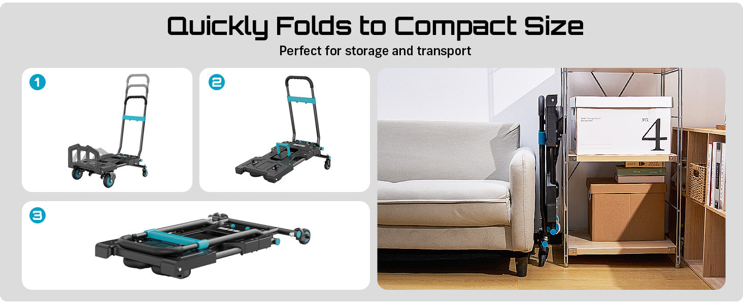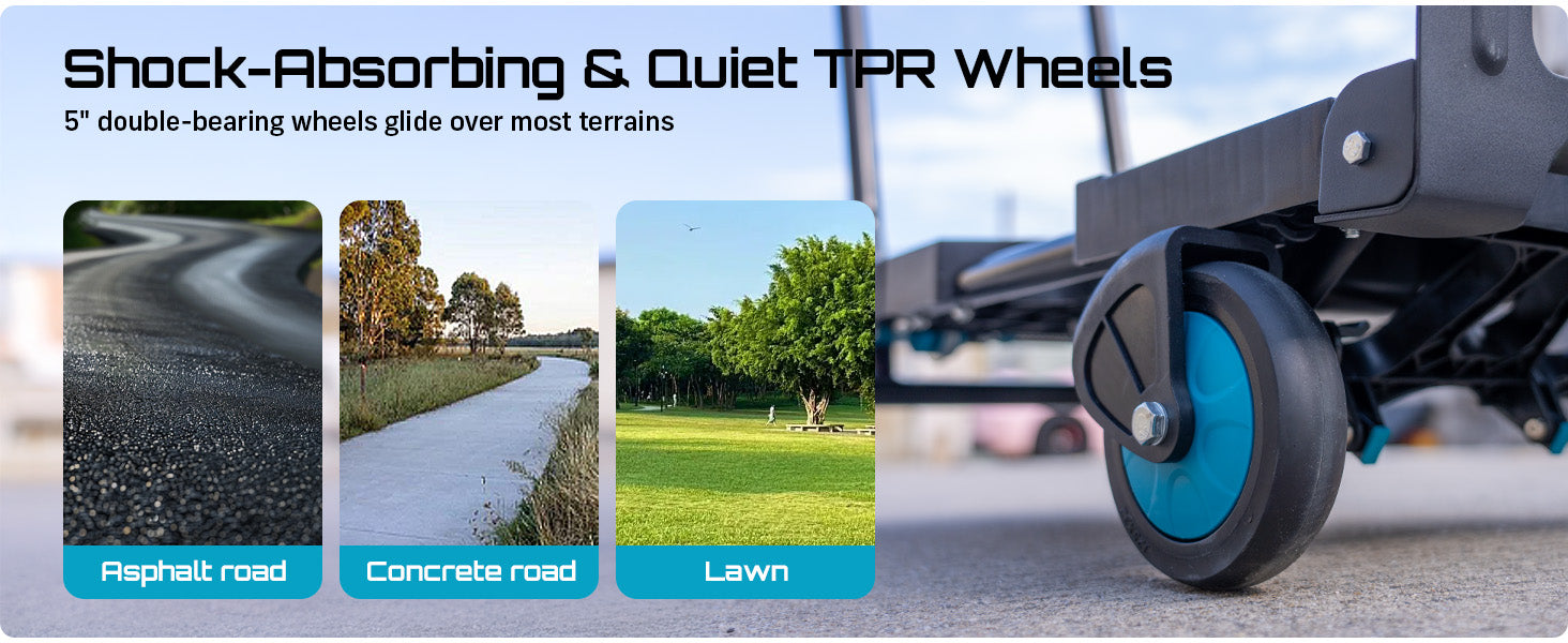 The folding hand truck frame collapses to just 5 inches thick, making it compact for storage in closets, car trunks, or garages. High-quality TPR wheels ensure smooth, quiet rolling, while lockable rear wheels keep the hand truck dolly stable during loading and unloading.