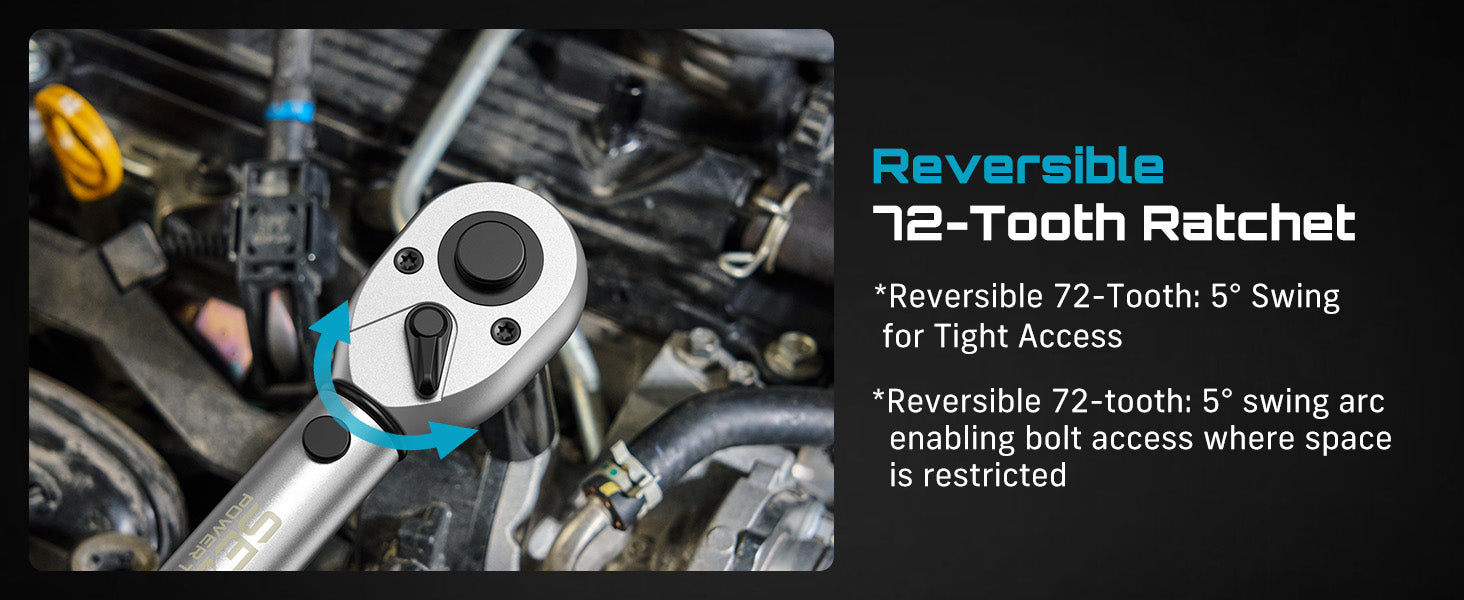 • Reversible 72-tooth ratchet – Smooth clockwise/counter-clockwise operation, 5° swing arc for tight spaces.
